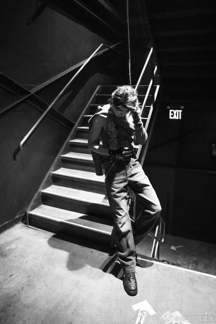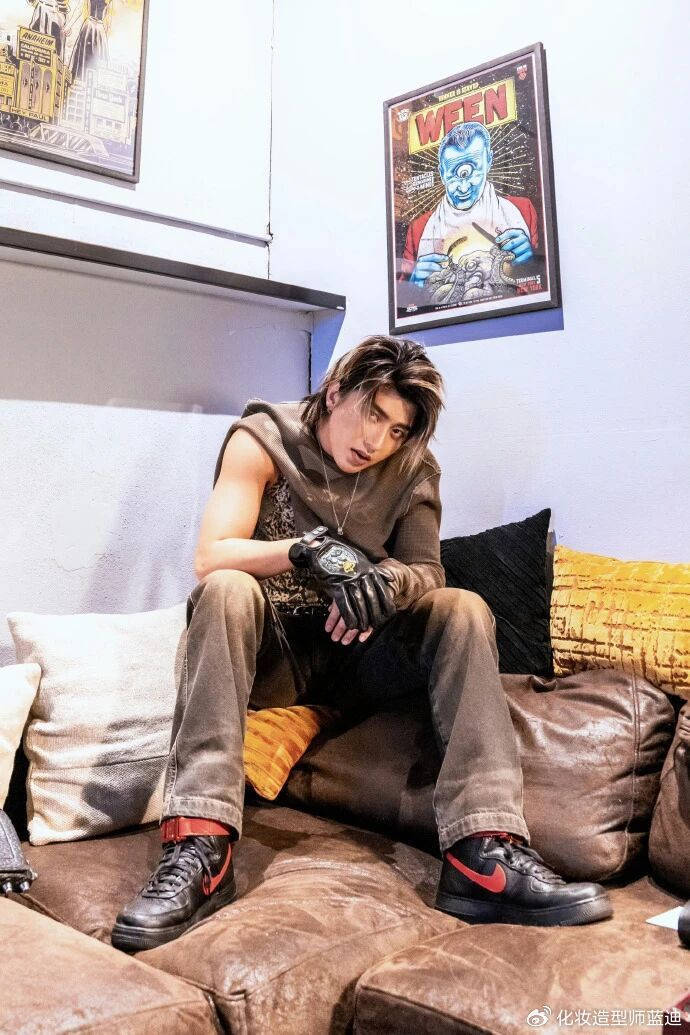 这套造型简直是潮流教科书级别的混搭!上半身用蟒纹背心释放野性,下半身却搭了条做旧水洗牛仔裤,垂坠感十足的裤腿随着舞步甩动,硬是把街头随性和高街凌厉揉成了教科书。最绝的是那双1017ALYX9SMxNIKE联名运动鞋,机能风搭扣和蟒纹的碰撞像火星撞地球,再配上黑色机能手套,连后台随手拍的侧颜都自带8级台风,粉丝狂刷“这腰臀比是真实存在的吗?”